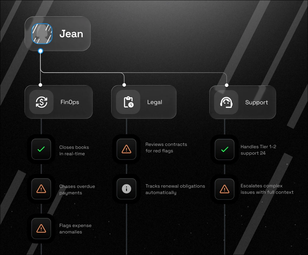 Jean understands the context; your data, history, priorities, and constraints. She reasons across systems, explains causes, and surfaces real options. And when a decision is made, she follows it through – coordinating action across teams and systems.